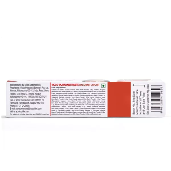 Product Code: 595 Catagory: Oral Care Weight / Quantity: 80 Grams Trade Mark / Brand: VICCO Vajradanti Material: VICCO Vajradanti Dalchini Package Size: xx MM Country of Origin: India