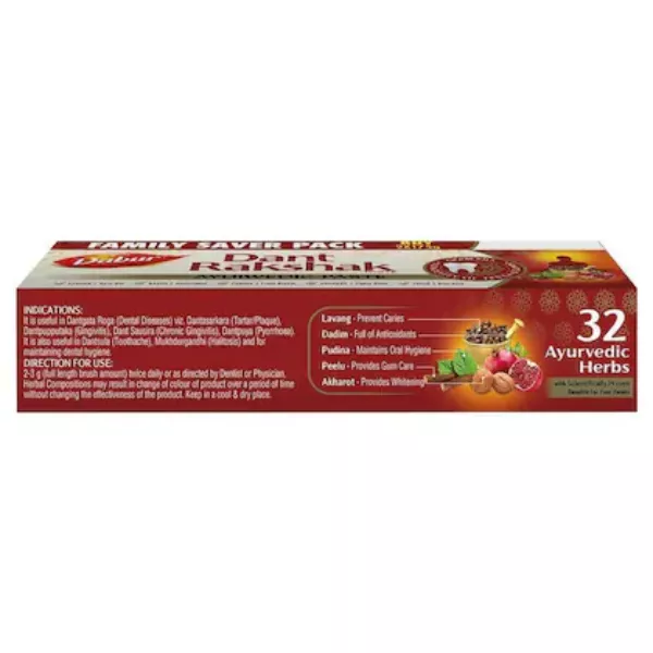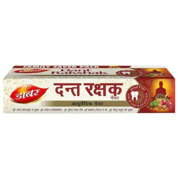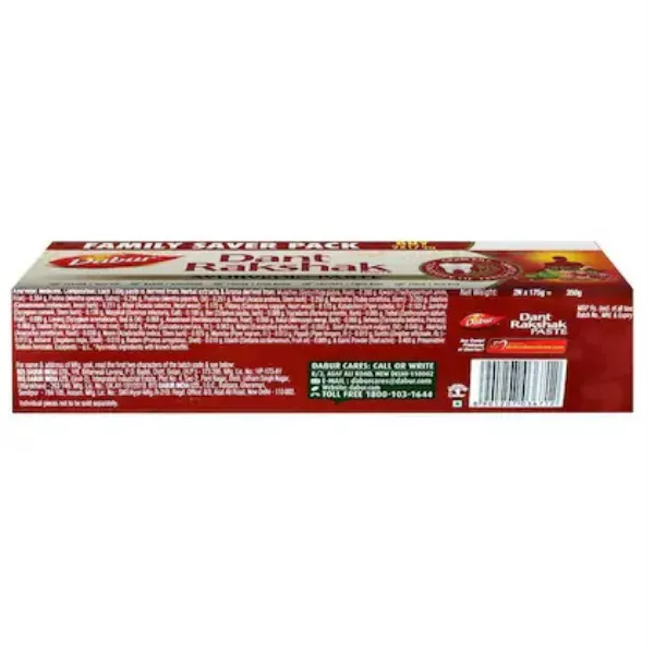 Product Code: 682 Catagory: Oral Care Weight / Quantity: 350 Grams Trade Mark / Brand: Dabur Material: Dabur Dant Rakshak Ayurvedic Paste 175 g (Pack of 2) Package Size: xx MM Country of Origin: India