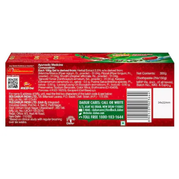 Product Code: 933 Catagory: Oral Care Weight / Quantity: 300 Grams Trade Mark / Brand: Dabur Material: Dabur Red Gel Toothpaste Package Size: xx MM Country of Origin: India