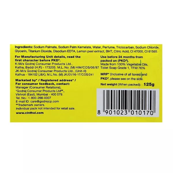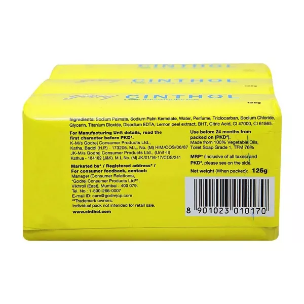 Product Code: 340 Catagory: Bathing Soaps Weight / Quantity: 375 Grams Trade Mark / Brand: Cinthol Material: Cinthol Lime Refreshing Deo Soap Package Size: xx MM Country of Origin: India
