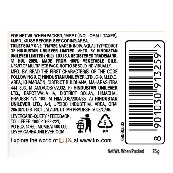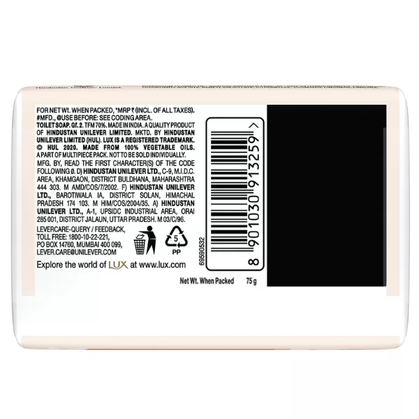 Product Code: 389 Catagory: Bathing Soaps Weight / Quantity: 300 Grams Trade Mark / Brand: Lux Material: Lux Velvet Glow Soap Package Size: xx MM Country of Origin: India