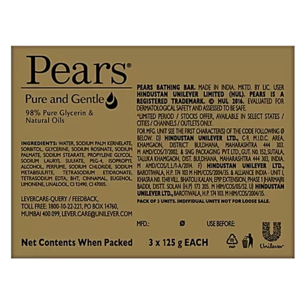Product Code: 808 Catagory: Bathing Soaps Weight / Quantity: 375 Grams Trade Mark / Brand: Pears Material: Pears Pure & Gentle Bathing Bar Package Size: xx MM Country of Origin: India