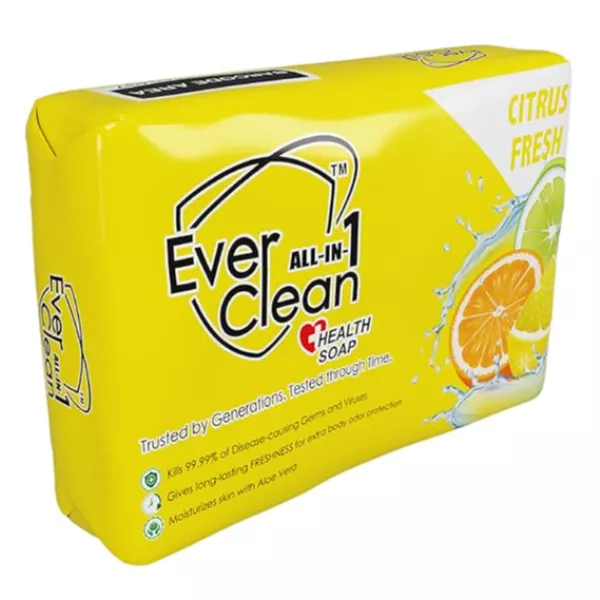 Product Code: 817 Catagory: Bathing Soaps Weight / Quantity: 40 Grams Trade Mark / Brand: EverClean Material: EverClean All-In-1 Health Soap Citrus Fresh 40g Package Size: xx MM Country of Origin: India