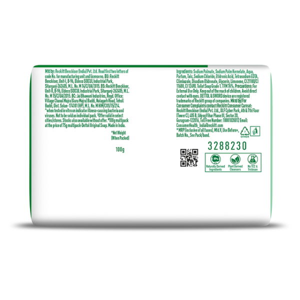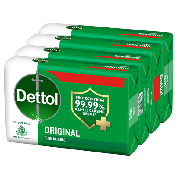 Product Code: 871 Catagory: Bathing Soaps Weight / Quantity: 400 Grams Trade Mark / Brand: Dettol Material: Dettol Soap Original Package Size: xx MM Country of Origin: India