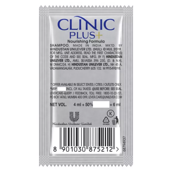 Product Code: 328 Catagory: Shampoo Weight / Quantity: 6 ML Trade Mark / Brand: Clinic Plus Material: Clinic Plus Shampoo Strong & Long, (Rs.1 Each) Package Size: xx MM Country of Origin: India