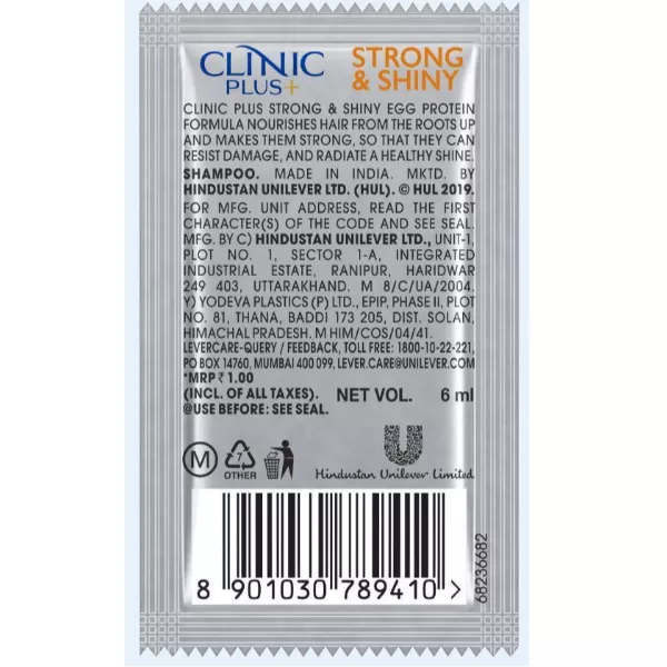 Product Code: 335 Catagory: Shampoo Weight / Quantity: 6 ML Trade Mark / Brand: Clinic Plus Material: Clinic Plus Strong and Shiny Shampoo Sachet (6ml) - Pack of 16 Package Size: xx MM Country of Origin: India