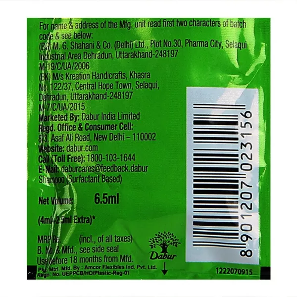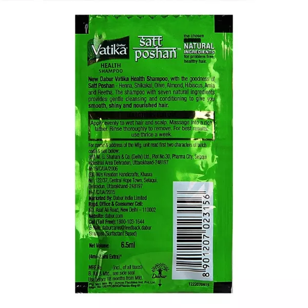 Product Code: 336 Catagory: Shampoo Weight / Quantity: 5 ML Trade Mark / Brand: Dabur Vatika Material: Dabur Vatika Smooth & Silky Hair Shampoo Package Size: xx MM Country of Origin: India
