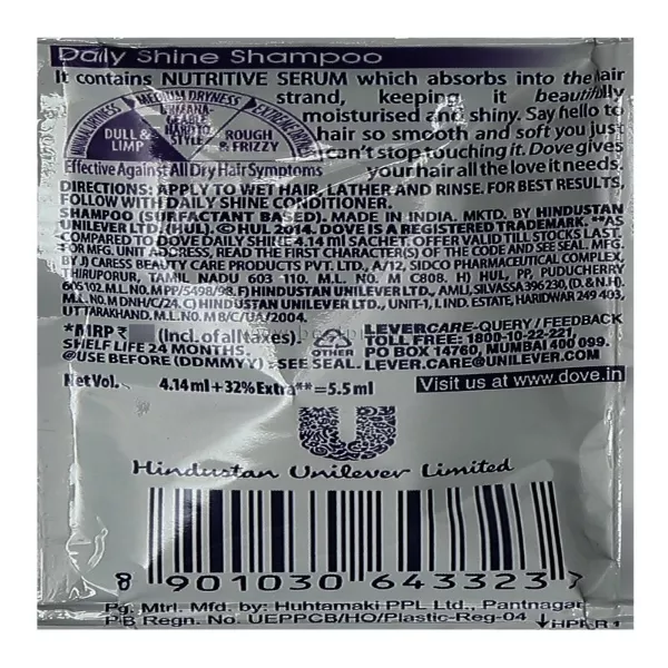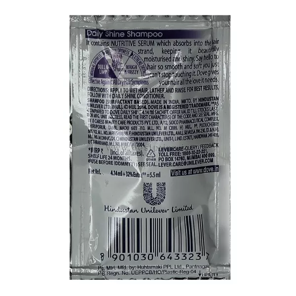 Product Code: 394 Catagory: Shampoo Weight / Quantity: 5 ML Trade Mark / Brand: Dove Material: Dove Shampoo Daily Shine Package Size: xx MM Country of Origin: India