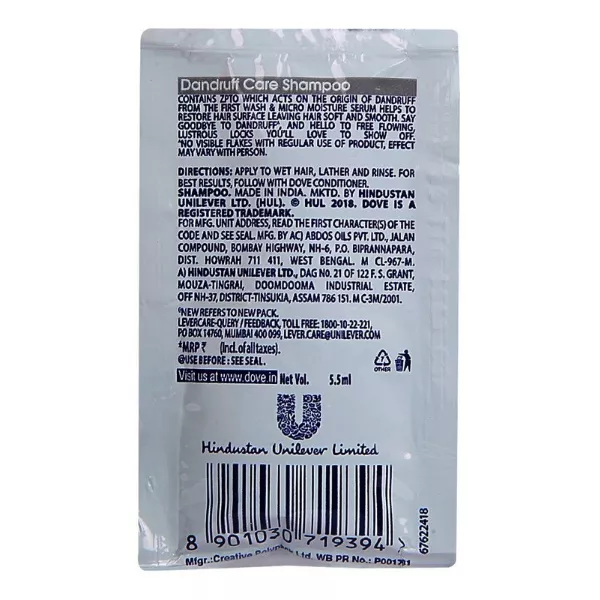 Product Code: 637 Catagory: Shampoo Weight / Quantity: 00 Grams Trade Mark / Brand: Dove Material: Dove Dandruff Care Hair Shampoo Package Size: xx MM Country of Origin: India