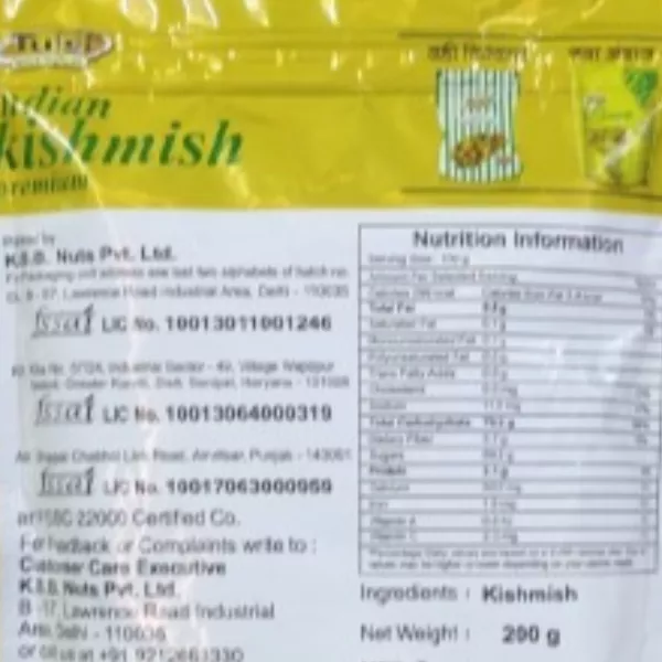 Product Code: 360 Catagory: Dry Fruits Weight / Quantity: 200 Grams Trade Mark / Brand: Tulsi Material: Kishmish Package Size: xx MM Country of Origin: India