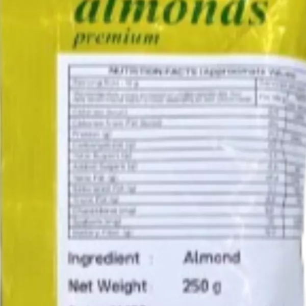 Product Code: 361 Catagory: Dry Fruits Weight / Quantity: 250 Grams Trade Mark / Brand: Tulsi Material: California Almonds Premium Package Size: xx MM Country of Origin: India