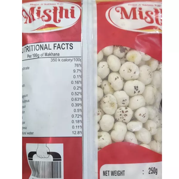 Product Code: 367 Catagory: Dry Fruits Weight / Quantity: 250 Grams Trade Mark / Brand: Misthi Material: Makhana (Fox Nut) Package Size: xx MM Country of Origin: India