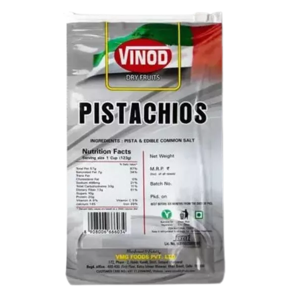 Product Code: 509 Catagory: Dry Fruits Weight / Quantity: 250 Grams Trade Mark / Brand: Vinod Material: VINOD Pistachio Pistachios Package Size: xx MM Country of Origin: India