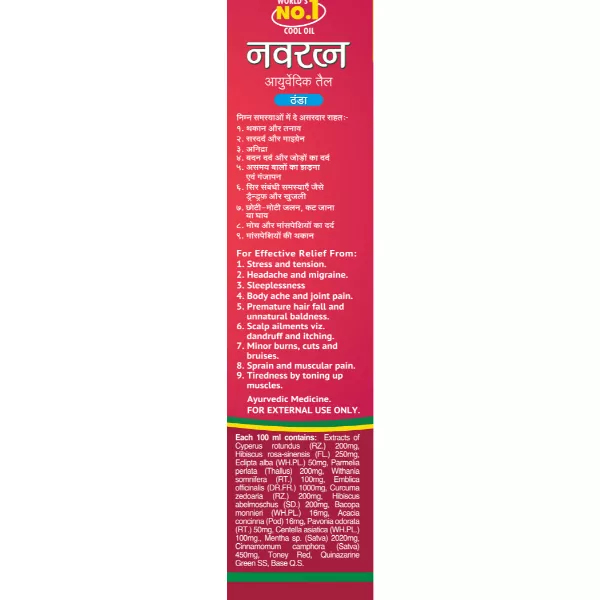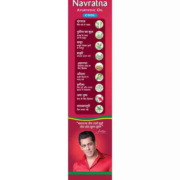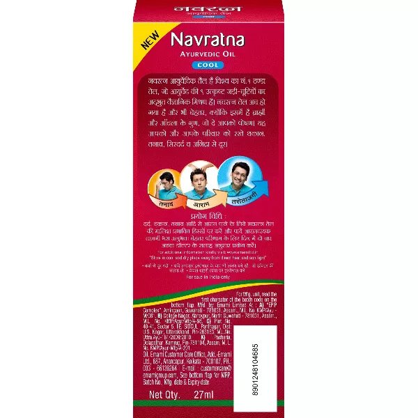 Product Code: 395 Catagory: Hair Oil Weight / Quantity: 27 ML Trade Mark / Brand: Navratna Material: Navratna Cool Hair Oil Package Size: xx MM Country of Origin: India