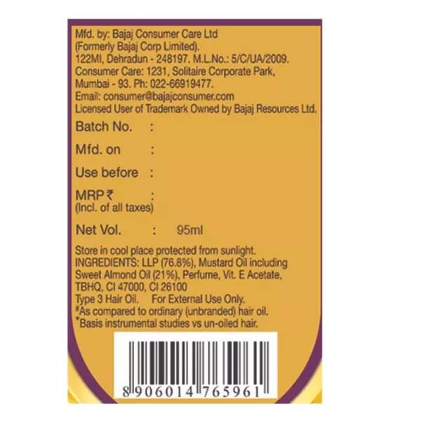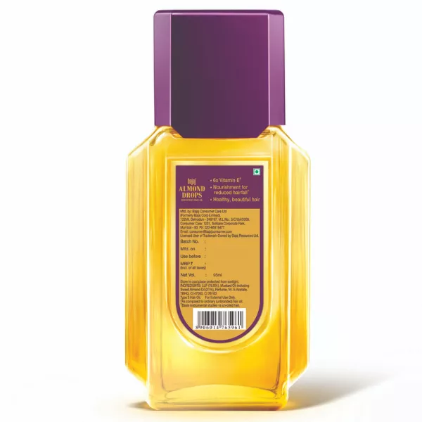 Product Code: 513 Catagory: Hair Oil Weight / Quantity: 95 ML Trade Mark / Brand: Bajaj Material: Bajaj Almond Hair Oil Package Size: xx MM Country of Origin: India