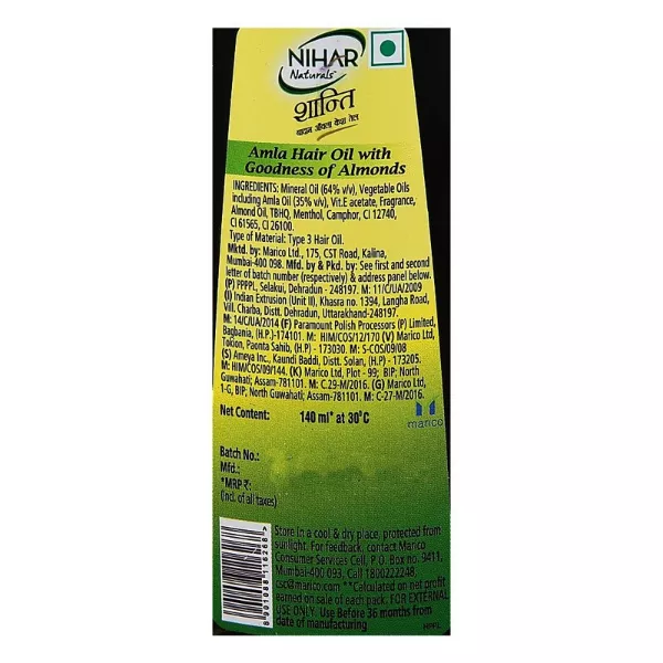 Product Code: 514 Catagory: Hair Oil Weight / Quantity: 140 ML Trade Mark / Brand: Nihar Material: Nihar Shanti Badam Hair Oil Package Size: xx MM Country of Origin: India