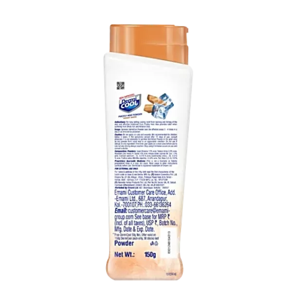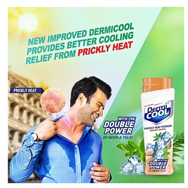 Product Code: 269 Catagory: Deodorant & Talc Weight / Quantity: 200 Grams Trade Mark / Brand: Dermicool Material: Dermicool Prickly Heat Sandal Package Size: xx MM Country of Origin: India