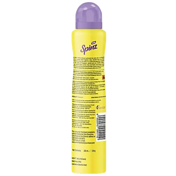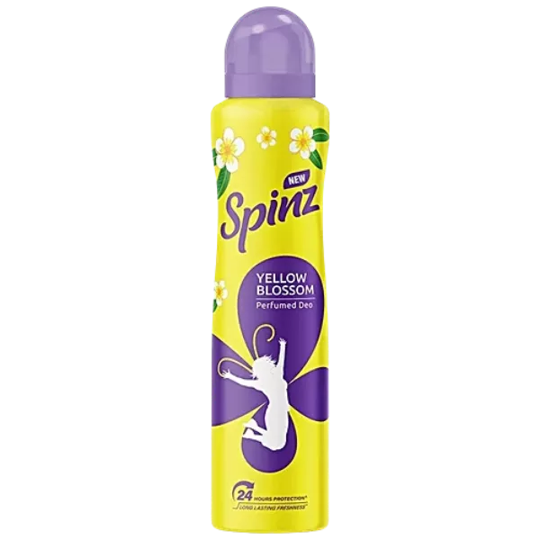 Product Code: 574 Catagory: Deodorant & Talc Weight / Quantity: 134 Grams Trade Mark / Brand: SPINZ Material: Spinz Yellow Blossom Perfumed Deo Package Size: xx MM Country of Origin: India
