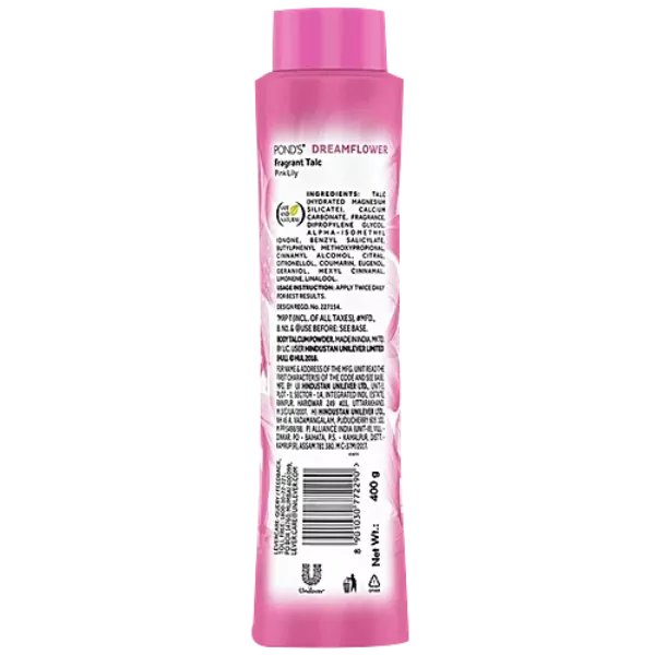 Product Code: 674 Catagory: Deodorant & Talc Weight / Quantity: 400 Grams Trade Mark / Brand: Ponds Material: Ponds Dreamflower Fragrant Talc Package Size: xx MM Country of Origin: India