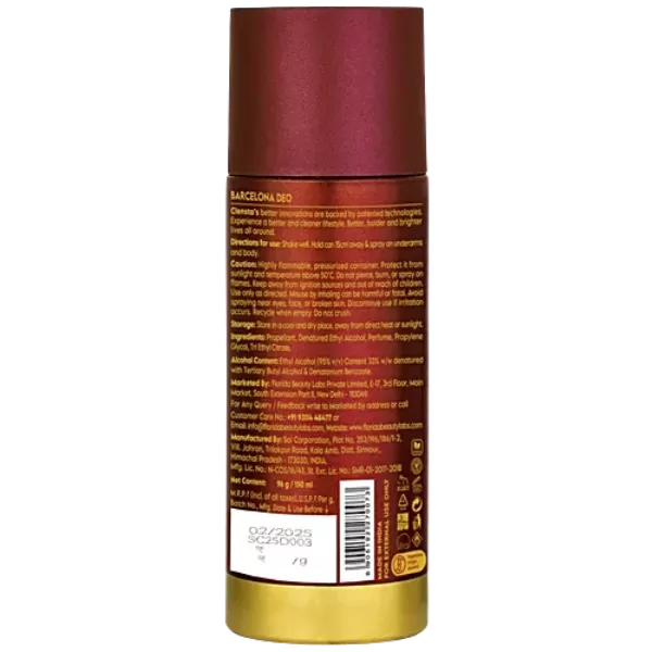 Product Code: 830 Catagory: Deodorant & Talc Weight / Quantity: 150 ML Trade Mark / Brand: Clensta Material: Clensta Barcelona Men Deodorant Body Spray Package Size: xx MM Country of Origin: India