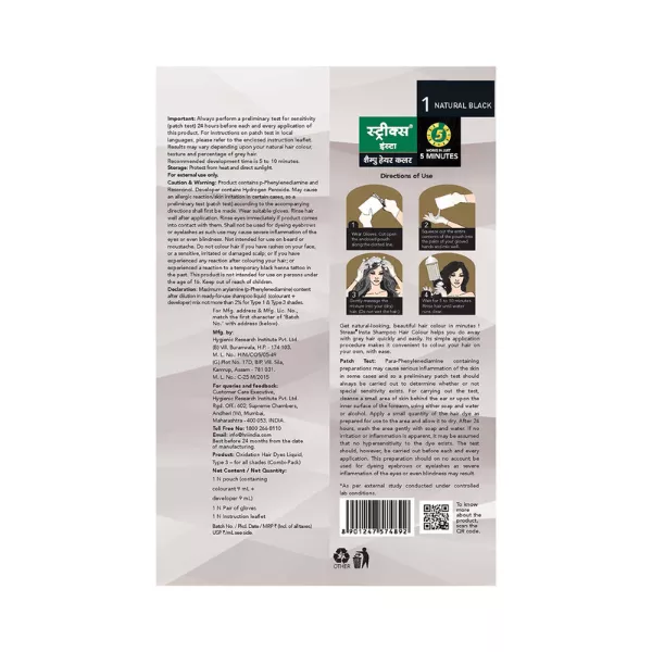 Product Code: 475 Catagory: Hair Care Weight / Quantity: 9 ML Trade Mark / Brand: Streax Material: Streax Insta Hair Color Natural Black Shampoo 9 ml/ 9 g Package Size: xx MM Country of Origin: India