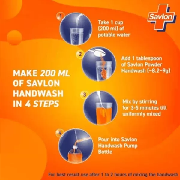 Product Code: 572 Catagory: Handwash Weight / Quantity: 8 Grams Trade Mark / Brand: Savlon Material: Savlon Powder Handwash 8.2 g, Makes 4X200 ml Package Size: xx MM Country of Origin: India