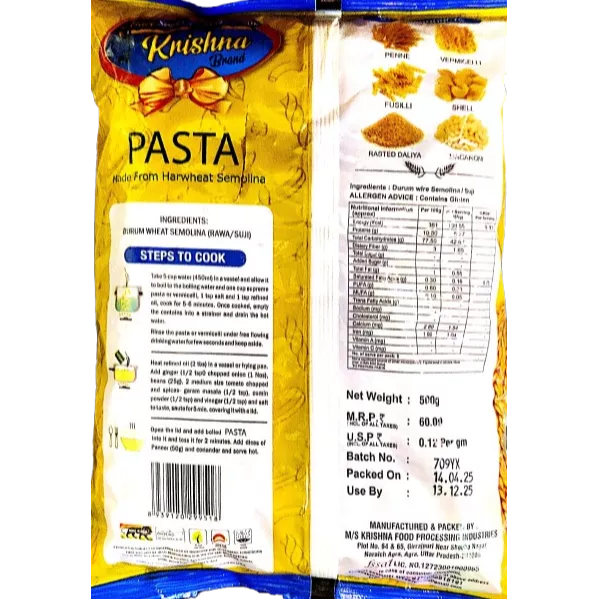 Product Code: 492 Catagory: Macroni & Pasta Weight / Quantity: 500 Grams Trade Mark / Brand: Krishna Material: Krishna Pasta Package Size: xx MM Country of Origin: India