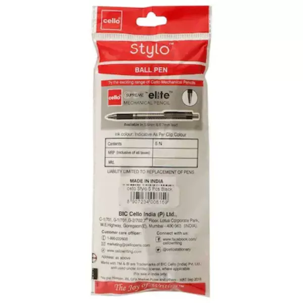 Product Code: 541 Catagory: Office & Stationery Weight / Quantity: 00 Grams Trade Mark / Brand: Cello Material: Cello Stylo Black Ball Pen Package Size: xx MM Country of Origin: India