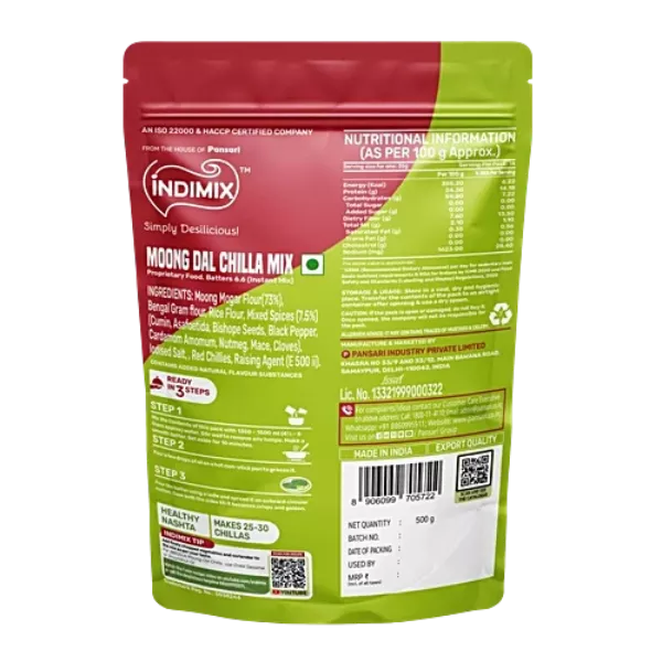 Product Code: 557 Catagory: Ready To Cook Mix Weight / Quantity: 500 Grams Trade Mark / Brand: Indimix Material: Indimix Moong Dal Chilla Package Size: xx MM Country of Origin: India