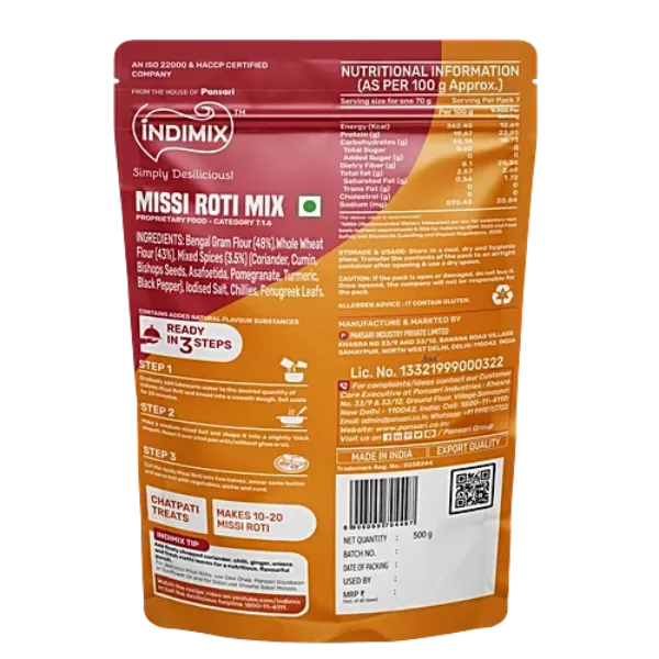 Product Code: 742 Catagory: Ready To Cook Mix Weight / Quantity: 500 Grams Trade Mark / Brand: Indimix Material: Indimix Missi Roti Mix - Ready To Cook, Protein Rich, 500 g Package Size: xx MM Country of Origin: India