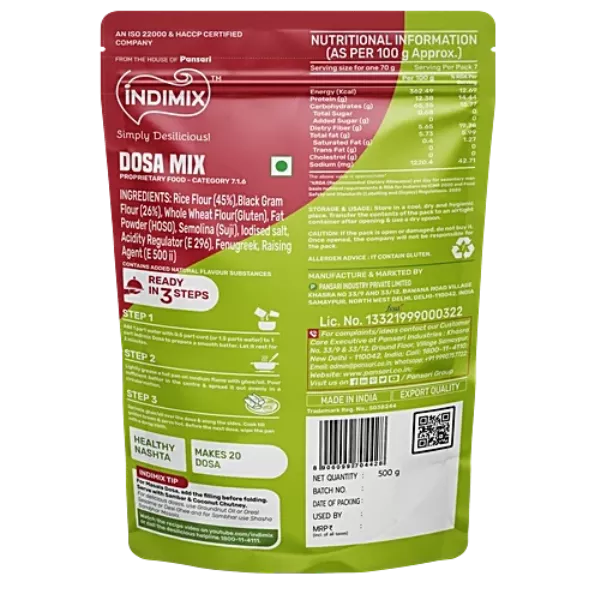 Product Code: 744 Catagory: Ready To Cook Mix Weight / Quantity: 500 Grams Trade Mark / Brand: Indimix Material: Indimix Rice Dosa Mix - Ready To Cook Package Size: xx MM Country of Origin: India