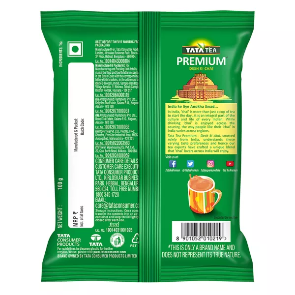 Product Code: 323 Catagory: Tea Weight / Quantity: 100 Grams Trade Mark / Brand: Tata Tea Premium Material: Tata Tea Premium Package Size: xx MM Country of Origin: India