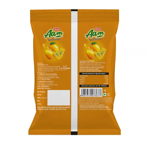 Product Code: 853 Catagory: Snacks & Sweet Tooth Weight / Quantity: 200 Grams Trade Mark / Brand: Dukes Material: Dukes Aam Candy Package Size: xx MM Country of Origin: India