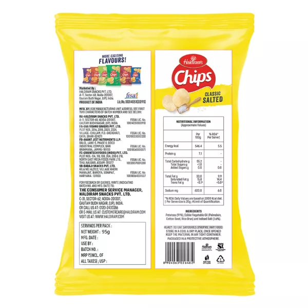Product Code: 858 Catagory: Snacks & Sweet Tooth Weight / Quantity: 95 Grams Trade Mark / Brand: Haldiram Material: Classic Salted Potato Chips Package Size: xx MM Country of Origin: India