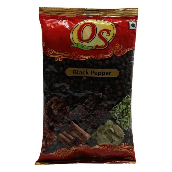 Product Code: 937 Catagory: Whole Spices Weight / Quantity: 100 Grams Trade Mark / Brand: OS Material: OS Black Pepper Whole Package Size: xx MM Country of Origin: India