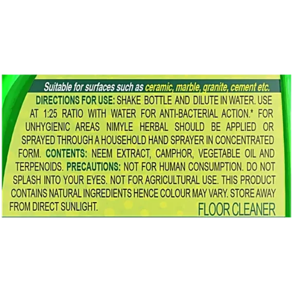 Product Code: 671 Catagory: Floor & Surface Cleaners Weight / Quantity: 200 ML Trade Mark / Brand: Nimyle Material: Nimyle Herbal Floor Cleaner Package Size: xx MM Country of Origin: India